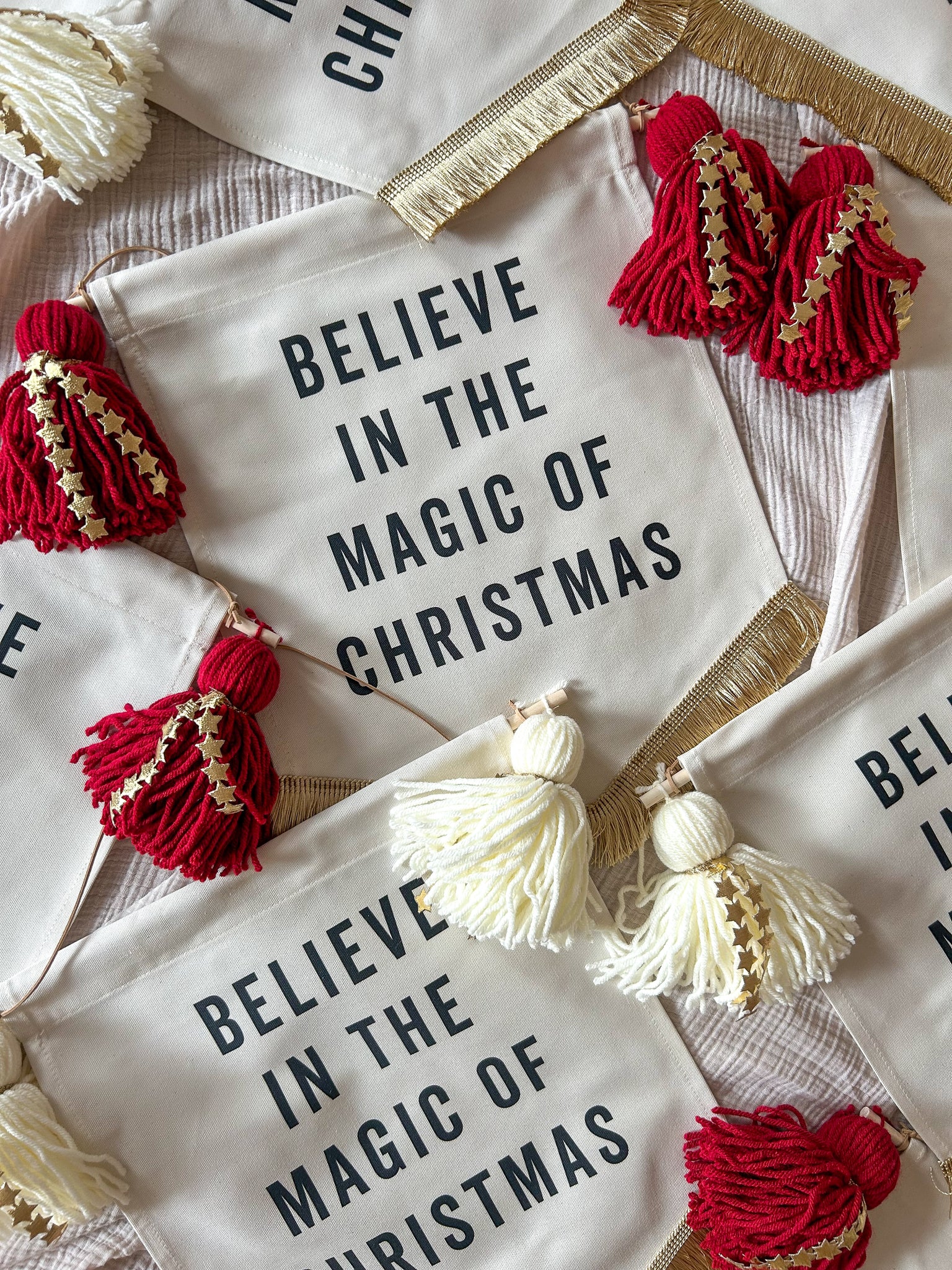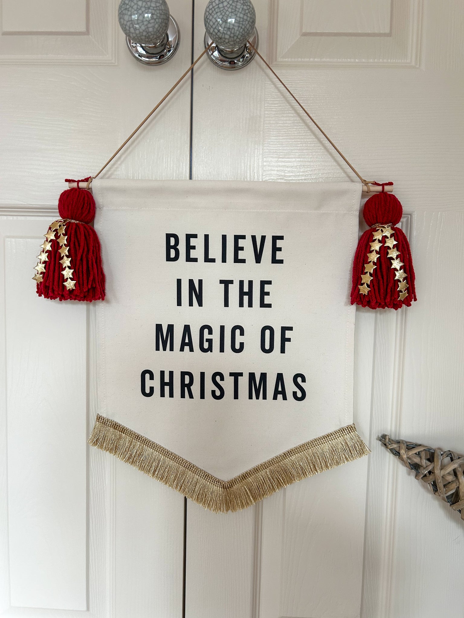 All Banners are handmade and this smaller size measures approx. 35cm wide x 45cm long inc. fringe. Finished with Festive red tassels with gold star detail & brushed gold fringe trim.