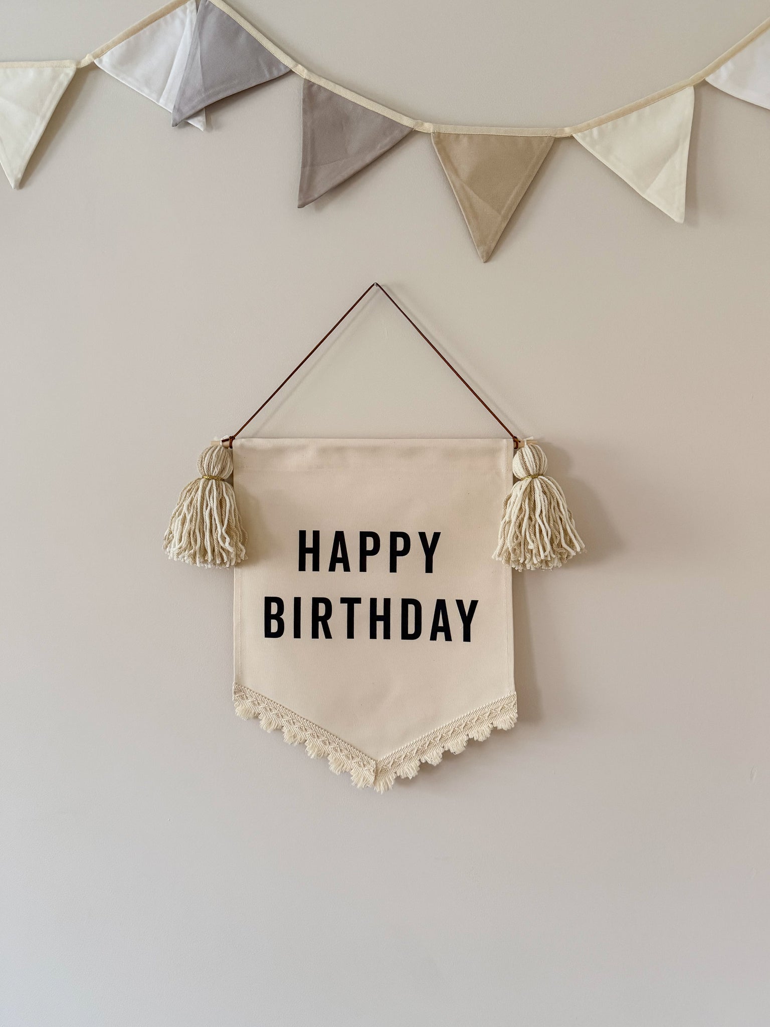 All banners are hand made and measure approx. 35cm wide X 45cm long with a tan faux suede cord for hanging.