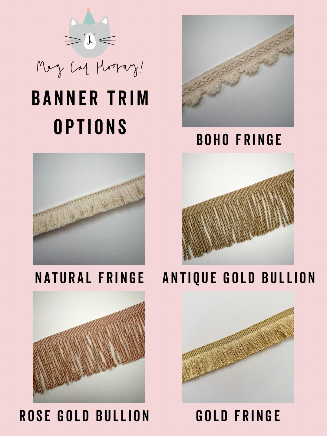 Choose Tassels in a wide range of colours. You can also choose a trim for your banner or leave it plain. Your banner is custom made for you to suit your style and theme.